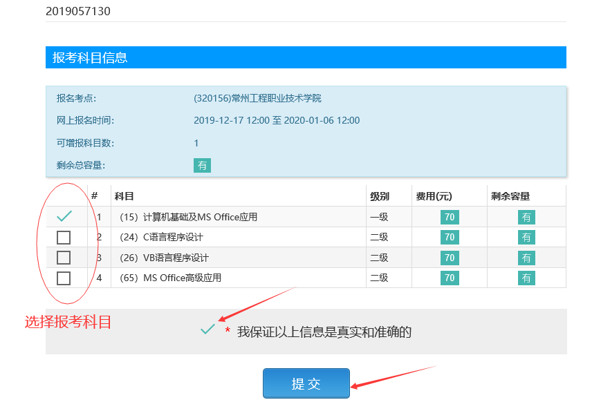 1、由于本次开始系统统一默认设置开考科目,报名过程中选择报考科目时会出现18项可以选择的考试科目,请务必注意本校考生只能选择上面表格里的三个科目:(15)一级计算机基础及MS Office应用,(24)二级C,(65)二级MS Office高级应用与设计,其余科目本校不具备开考条件。如未仔细看要求误报了其他科目,支付的报名费用将无法退回!!!