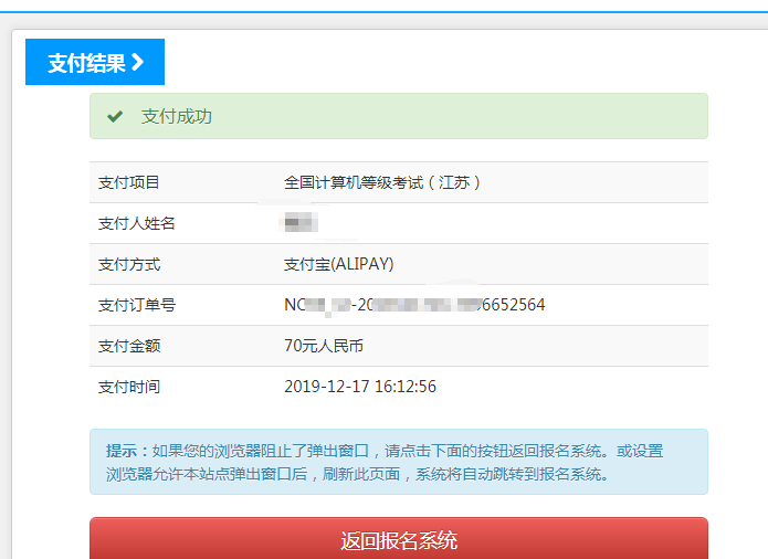 提示:支付后不要急着关闭网页,待系统自动跳转到支付成功页面